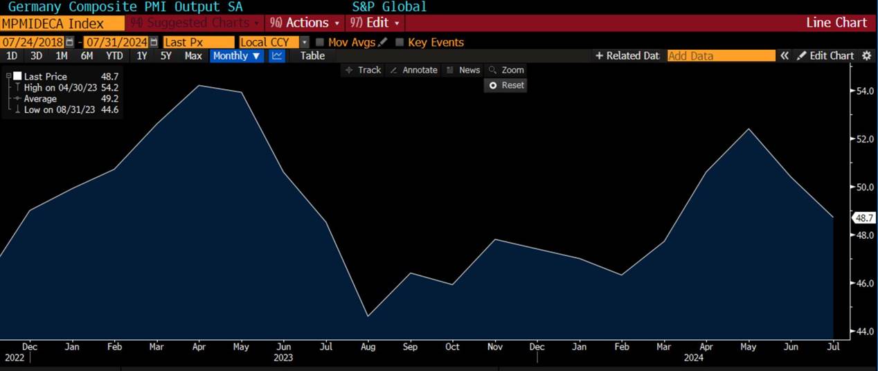 • Avrupa tarafında temmuz ayı öncü PMI verilerini almaya başladık. Özellikle Almanya tarafında bileşik PMI’ın sürpriz bir şekilde daralma bölgesine geçmesi AMB açısından Eylül ayı faiz indirimini destekliyor. Avrupa tarafında büyüme riskleri Avrupa hisse endekslerine satış ve EUR tarafına satış getirirken Tahvil getirilerinde düşüş var.