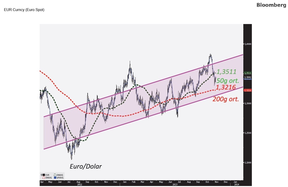 Euro/Dolar 25 Ekim'de başladığı düşüşüne devam ediyor. Grafikten de görülebileceği üzere 2012 Ağustos'unda başlayan yukarı yönlü bandın aşılması sonrasında kurun pahalı olduğu ve bölgede dezenflasyona katkıda bulunduğu sıkça dile getirildi. İşte bu temel faktörlerin bant dışına çıkarak aşırı değerlenme baskısı yarattığını görüyoruz.