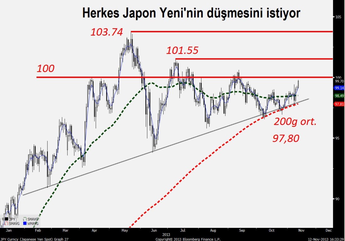 Dolar/Yen yeniden 100 yolculuğuna çıkıyor ancak önünde önemli bir engel var. Aslında bir engelden ziyade bir bölge var. 100-100,50 aralığı. Bu seviyenin kırılması ise bizi doğrudan 103 seviyesine taşıyacak. Bu atakta aşılamaması ise hemen 50 günlük ortalama olan 98,50'yi gündeme getirecek.