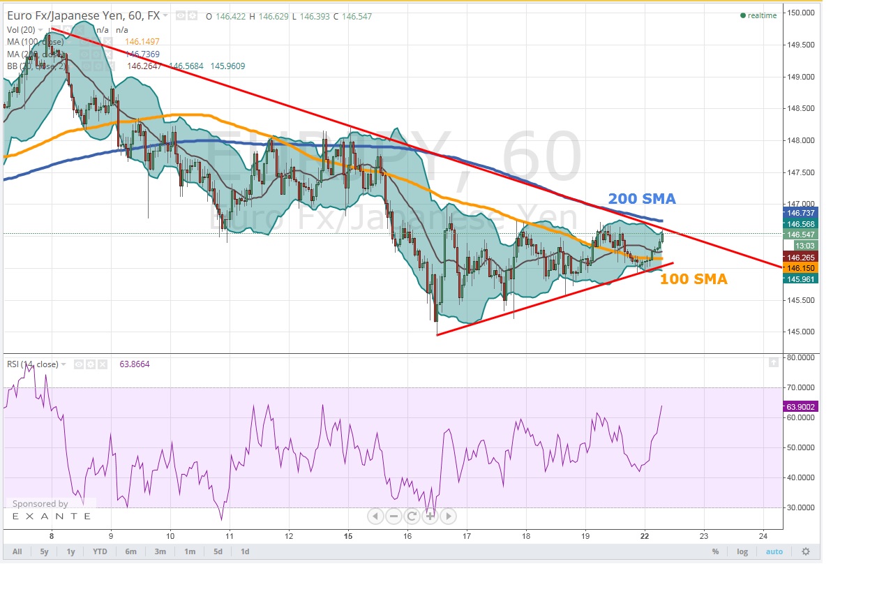 100 saatlik hareketli ortalamasını destek 200 saatlik hareketli ortalamasını ise direnç olarak çalıştıran EURJPY 'de pozisyon almak isteyenler kırılımın gerçekleştiği yön doğrultusunda küçük miktarda pozisyon alabilirler
