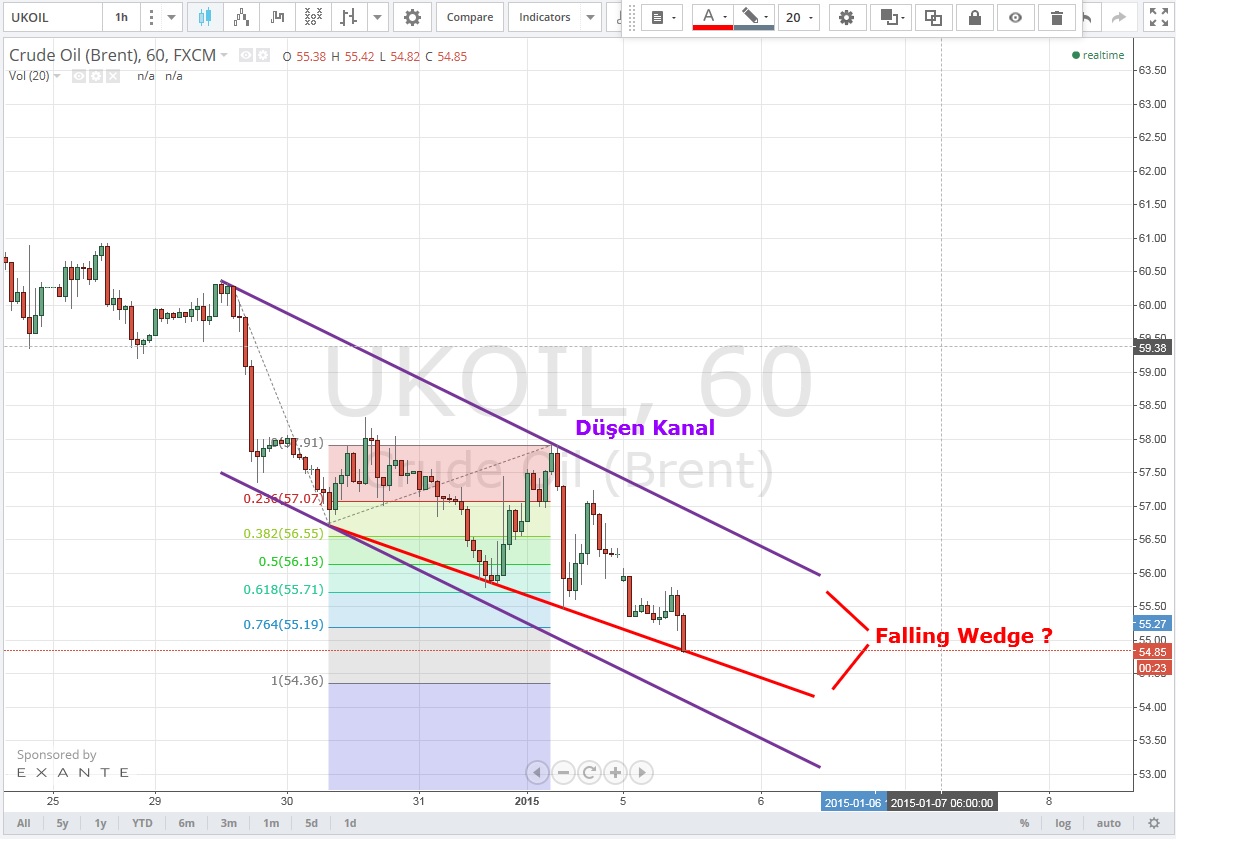 Fiyatlar 54 USD seviyelerini dip yapar ve buradan yukarı dönerek üst bandı kırarsa düşen kanal ile birlikte düşen kama formasyonunu kıracağını söylemek de mümkün