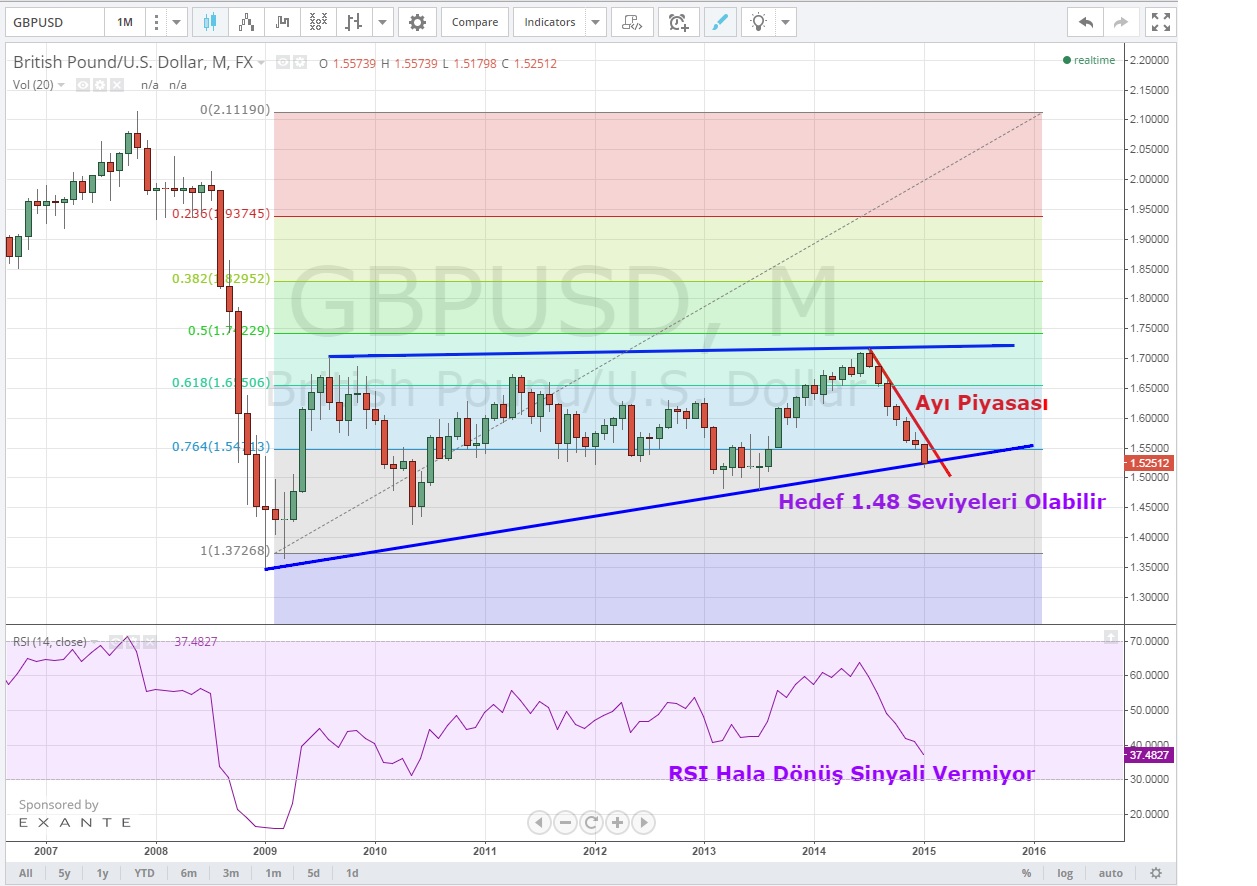 Uzun vadeli grafilere baktığımızda hala ayı piyasası etkisinde olan ve 1.53 desteğinin de altına sarkan GBP 'de bu seviyelerin tutmaması ile 1.48 'li seviyeler hedef olmaktan uzak değil