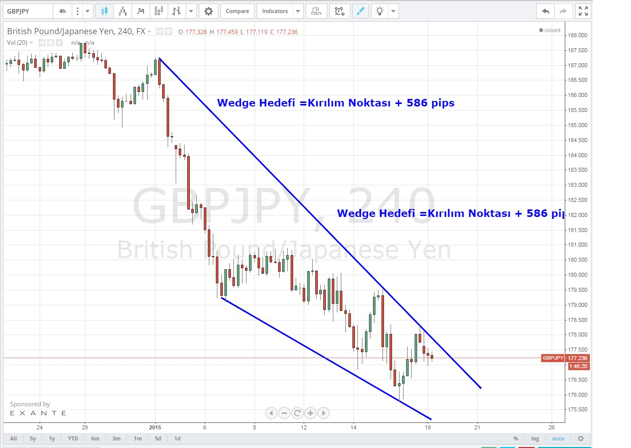 Buna göre düşen Kama Formasyonu kırıldığı taktirde teknik hedef düşüş trend kırılımının gerçekleştiği yerden 586 pip
