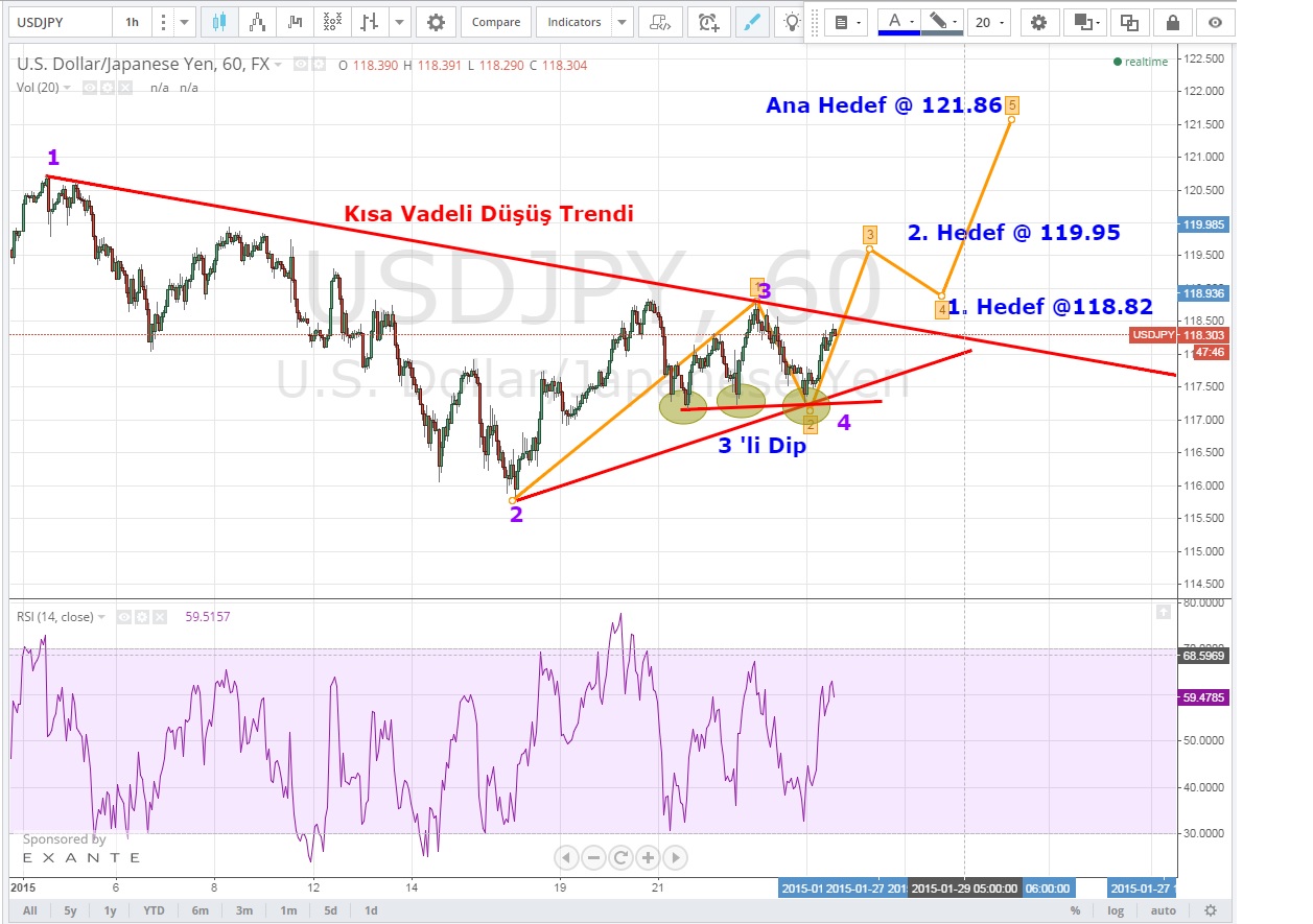 Teknik olarak baktığımızda 117.20 seviyesini dip yapmaya çalışarak kısa vadeli düşüş trendini zorlayan bir USDJPY var karşımızda