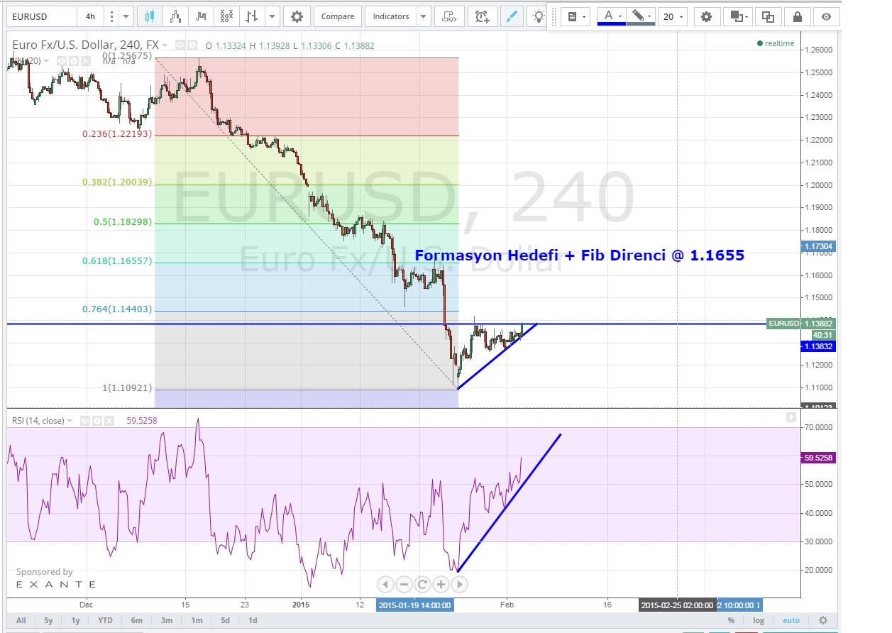 Yükselen üçgen formasyonunu yukarı yönlü kırmaya hazırlanan paritede 1.1382 seviyesi kritik direnç olarak öne çıkıyor .Geçilmesi durumunda ilk hedef Fibo Duzeltme seviyesi + Formasyon Hedefi olan 1.1655 olarak belirlenebilir
