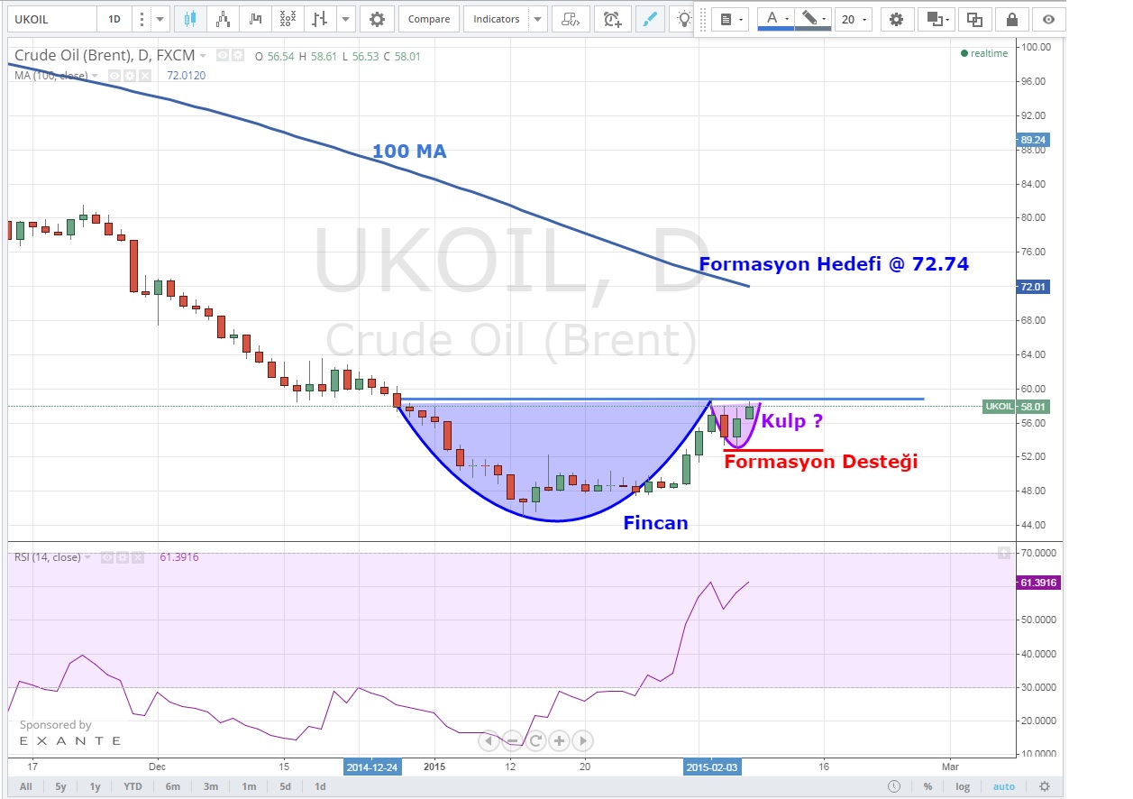 Brent petrolde günlük grafiklerde Fincan -Kulp oluşumu tamamlanmak üzere .Buna göre 59 üzerinde bir kapanış bizi 70 + seviyelerine götürecektir .53 USD altında bir kapanış olması durumunda formasyon geçerliliğini kaybeder .
