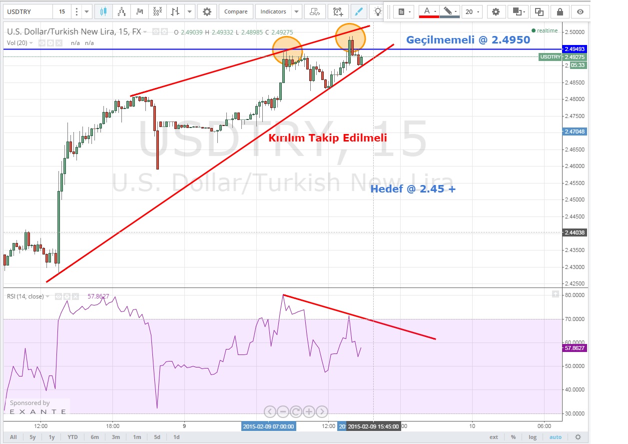 Yükselen kamanın kırılmasını beklemek teyid için sağlıklı olacaktır .Stop Loss seviyesi 2.4950 ve biraz daha risk almak isteyenler için 2.50 olarak belirlenebilir