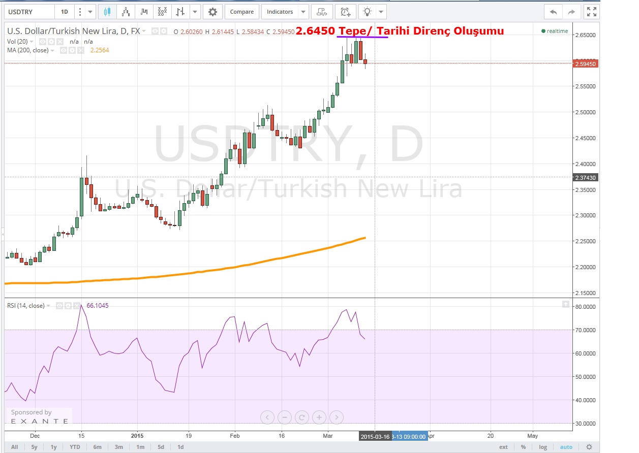 Daha önce Kısa vadede bir OBO oluşumundan bahsetmiş ve olası geri çekilmelerin USD alım fırsatı yaratabileceğini konuşmuştuk http://www.tradeall.com/teknik-analiz-detay/1620/usdtry--kisa-vadeli-obo. USDTRY 'de bahsettiğimiz kısa vadeli trend çizgisi kırılmadığından alış fırsatı oluşmadı ve parite 2.6450+ seviyesine kadar yükselerek tarihi yeni bir zirve yaptı ,dolayısıyla pozisyon almak için uygun koşullar oluşmadı