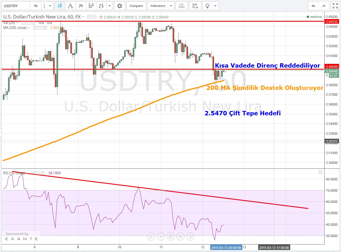 Daha kısa vadeye bakınca 2.5960 seviyesinde direnç oluşumu ve fiyatların buraya yaklaştıkça ayılar tarafından aşağı itildiği dikkat çekiyor .Alt tarafta ise 200 MA şimdilik destek oluşturmuş durumda