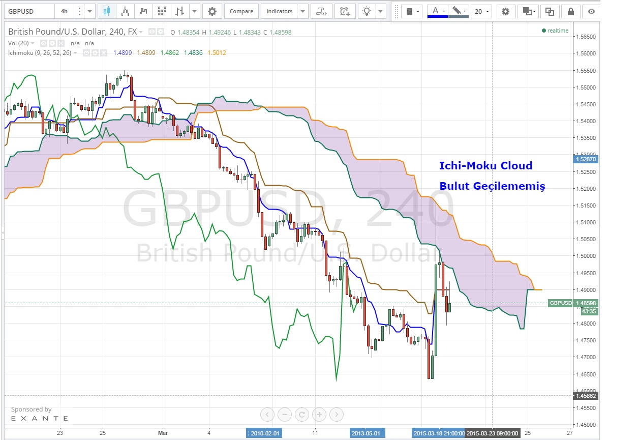 Dün önce BOE ile birlikte 1.4635 ‘e inen akşam saatlerinde ise FOMC ile birlikte 1.5159 seviyelerine kadar yükselen GBPUSD burada Ichi –Moku Bulut direnci ile karşılaştı ve kıramayarak yaklaşık 300 piplik bir düşüş yaşadı .Kraliçe, kısa vadede 100 EMA ile 200 EMA arasında destek /direnç yapmaya çalışıyor