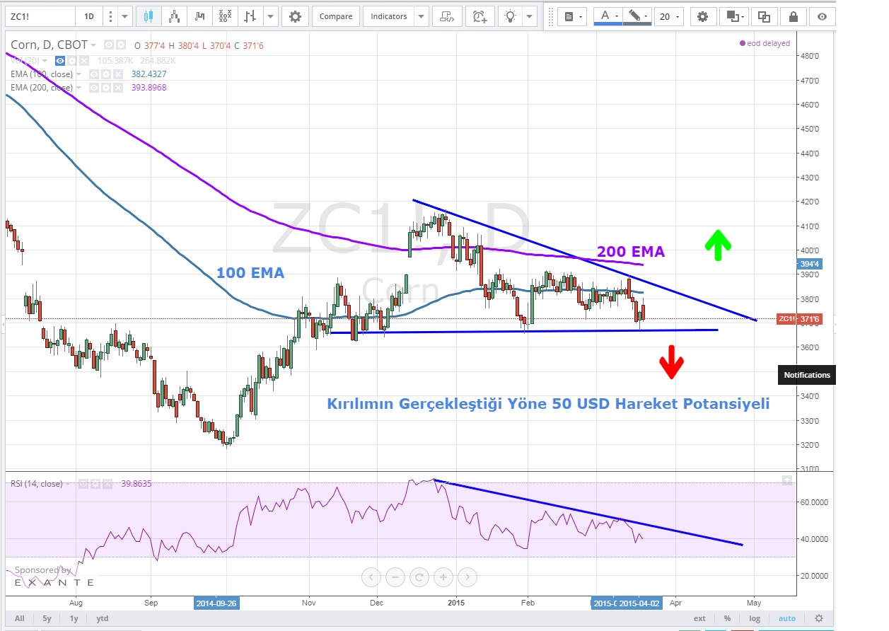 Mısır Vadeli kontratlarında günlük grafiklerde üçgen formasyonu dikkat çekiyor .Giderek sıkışan fiyatlarda üçgenin kırılması ile 50 USD ‘ye varan sert bir hareket beklenebilir .
