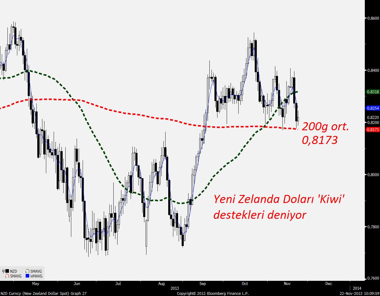 0,8173'e kadar geri çekilen Kiwi burada destek buldu. Gelecek yıl faiz artırması beklenen ender ülkelerden biri olan Y. Zelanda'nın kuru müdahale ya da konuşarak ne kadar aşağı çekebileceği hayli muğlak. Bu sebeple, yatırımcıların ilk tercihi her zaman Kiwi'yi uzun taraftan oynamak olacaktır. Bunun için 200 günlük ortalama bir zarar kesme noktası olabilir. 0,84 ise son iki turda da aşılamayan bölge konumunda.