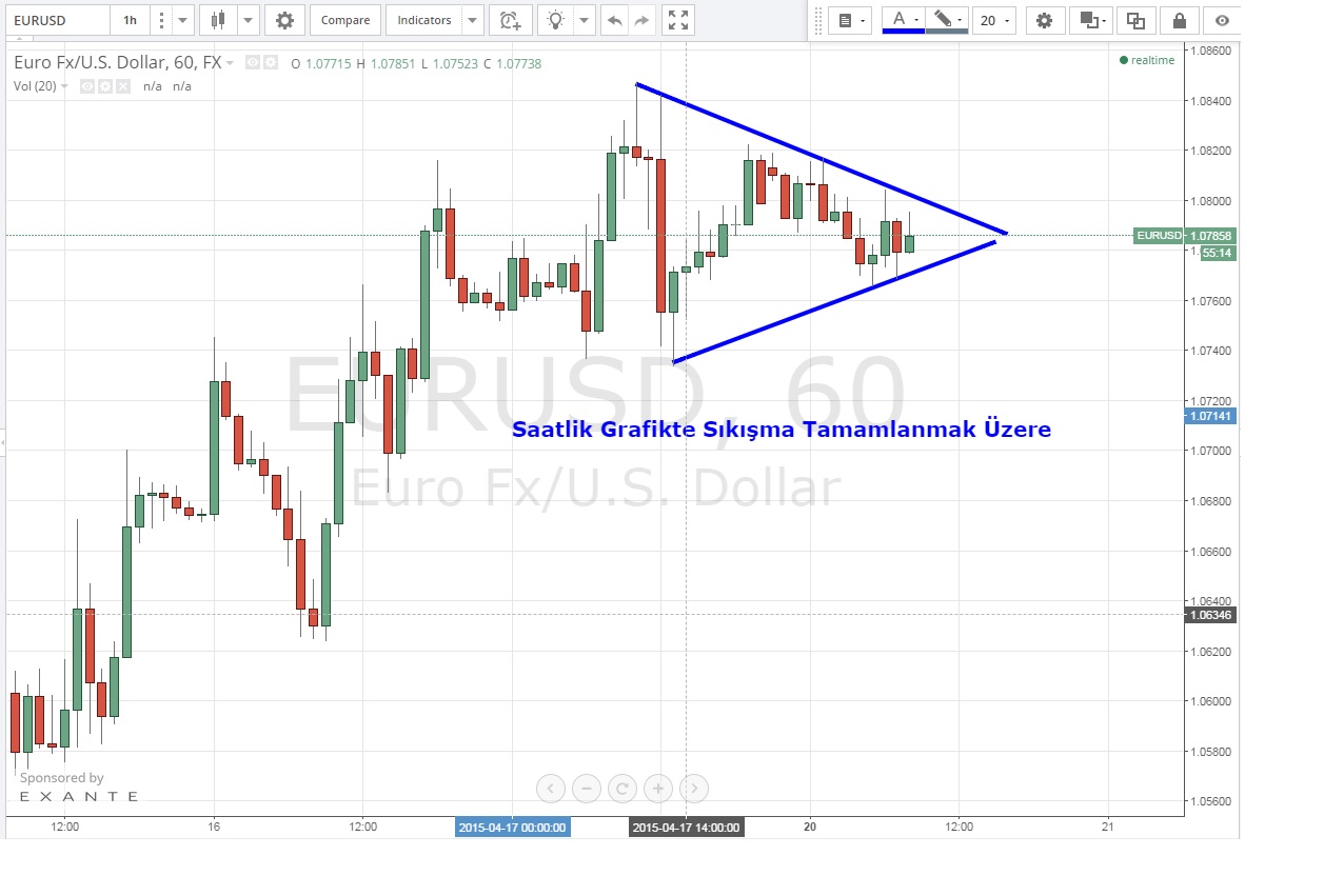 Yine bir alt vadeye indiğimizde de saatlik grafiklerde sıkışmanın tamamlanmak üzere olduğunu görüyoruz