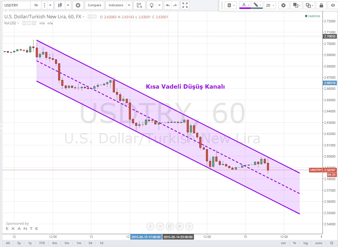 Günlük grafiklere bakınca destekleri birbir kıran ve beklentimiz paralelinde 2.57+ seviyelerine yönelen paritede kısa vadede de oluşan düşüş kanalı dikkat çekiyor