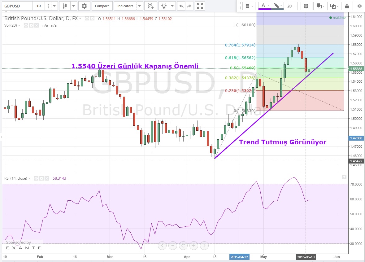 Teknik olarak baktığımızda günlük trend oluşturmaya çalışan Cable 'da 1.5540 üzeri kapanışlarda