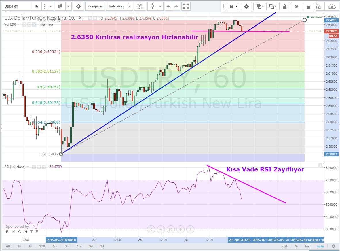 Kısa vadeli grafiklere baktığımızda paritede yorulma sinyali dikkat çekiyor. 2.6350 seviyesi kırılması durumunda ilk destek 2.6230 'da