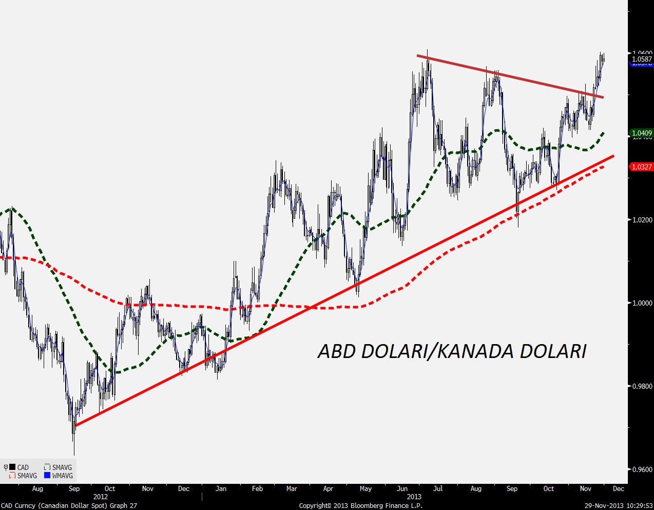 Teknik anlamda baktığımız zaman, son 1 haftada en çok değer kaybeden para birimlerinden birisi olan Kanada Doları, 19 Eylül’de 1,02'den başlayan düşüşünde 27 Kasım günü dolara karşı 1,06 seviyesini test etti. Teknik göstergelerin oldukça pozitif olduğu, 100 ve 200 günlük hareketli ortalamalarının üstünde seyreden döviz çiftinde olası bir kötü gelecek büyüme verisi burada son 3 yılın zirvesi olan kritik 1,0680 seviyelerinin görülebileceğini düşünen yatırımcılar, 1,0560 seviyesini stop-loss olarak takip edebilirler.