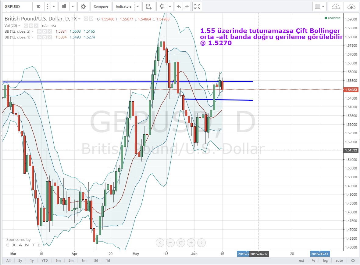 Yine günlük olarak baktığımızda çift bollinger üst bandında tutunmaya çalışan GBP ,burada tutunamaması durumunda 1.5250 seviyesine tekrar gerileyebilir.