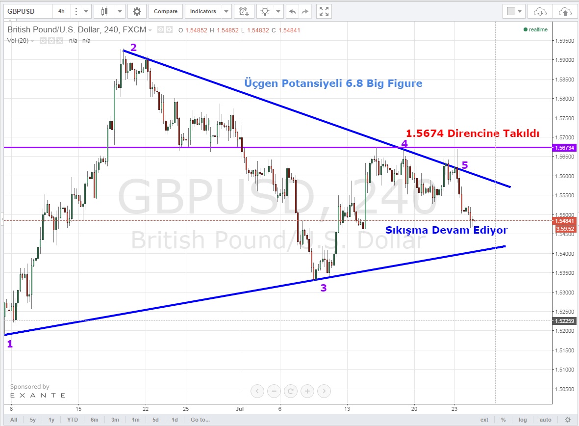 Cable, bahsettiğimiz üçgeni kırdıktan sonra daha önce 2 kez tepe oluşturduğu https://www.tradeall.com/teknik-analiz-detay/2140/gbpusd--gunici-guncelleme ve İngiltere 'den gelen Haziran Ayı Perakende Satış verilerinin beklenti altı kalması ile 3. kez de kırmayı başaramadığı 1.5674 direncinde bu kez sert satış yedi.