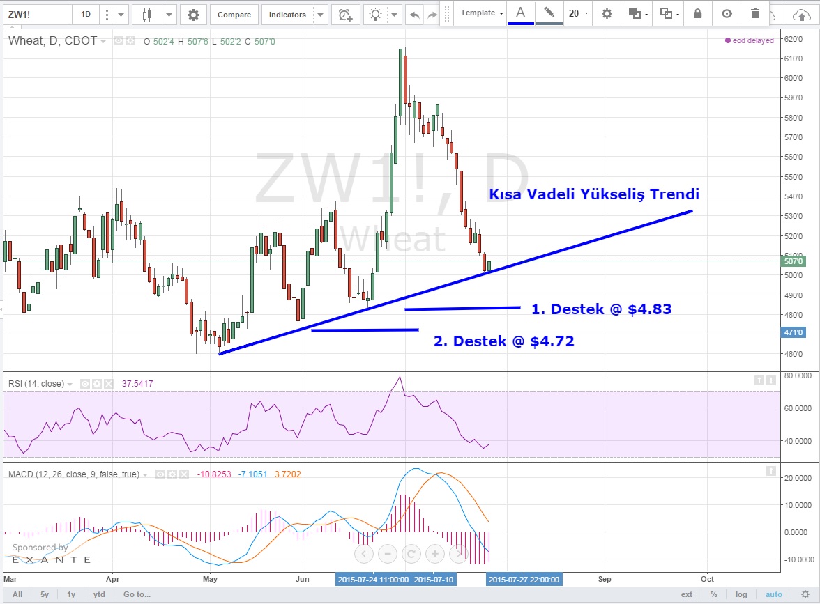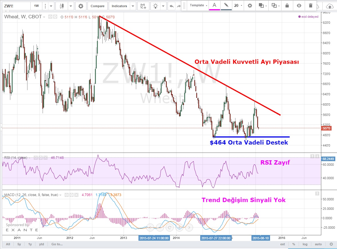 Aynı zamanda teknik olarak da uzun vadeli mutlak bir ayı piyasasından bahsedebileceğimiz buğday fiyatları için $4.64 şimdilik destek noktası olarak dikkat çekiyor.