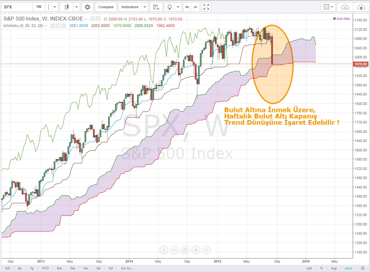 Haftalık olarak baktığımızda ise Ichimoku bulut sınırına dayanan S&P endeksi için Cuma günü itibariyle bulut altında kapanış olması durumunda trend değişebilir ve piyasada ayılar hakimiyeti ele geçirebilir