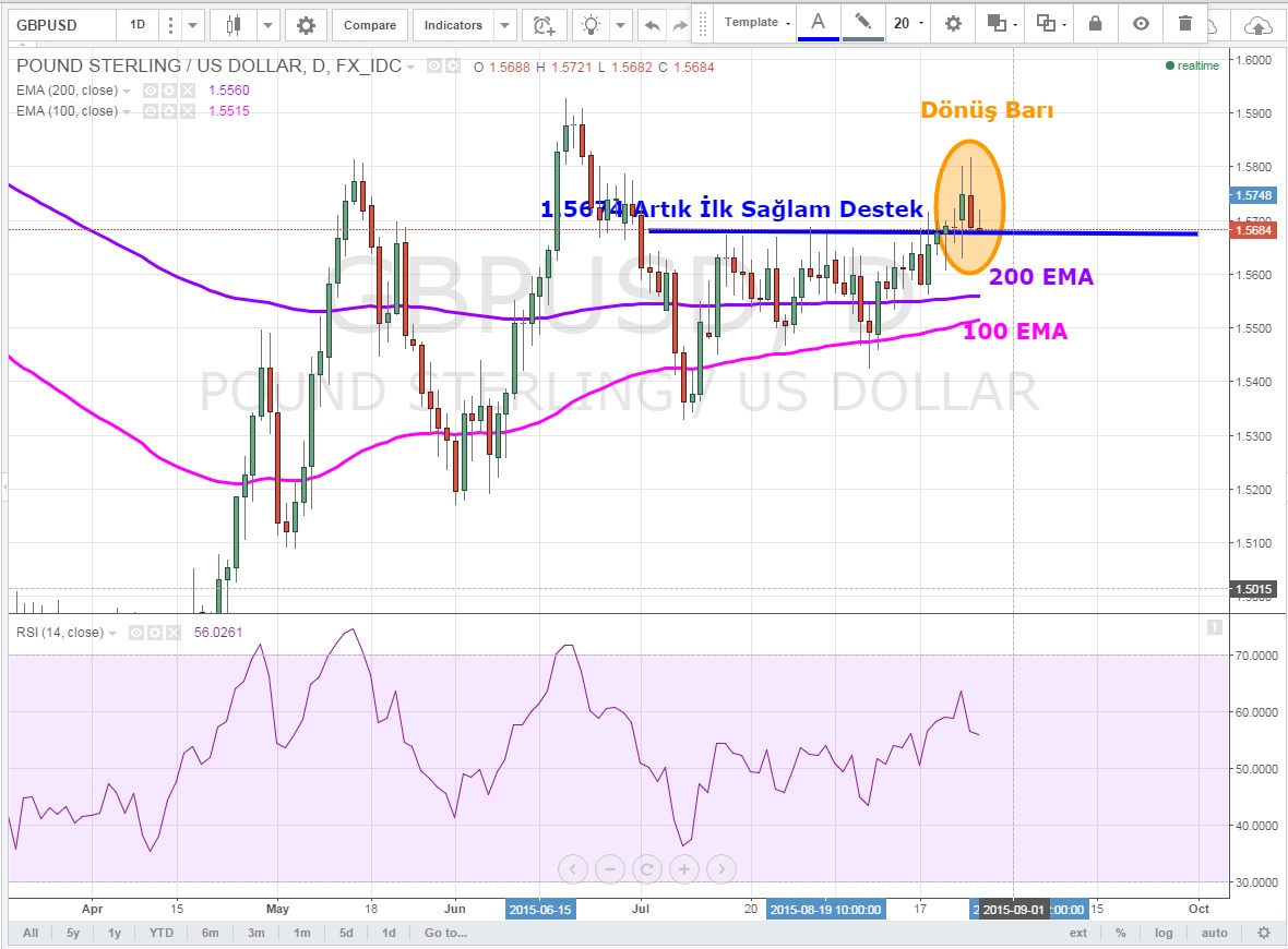 GBPUSD dün 1.5818 yükseğini yaptıktan sonra gelen sert satış ile günlükte dönüş mumu oluşturarak kapanışını neredeyse günün en düşüğünden (1.5687 vs 1.5681) gerçekleştirdi