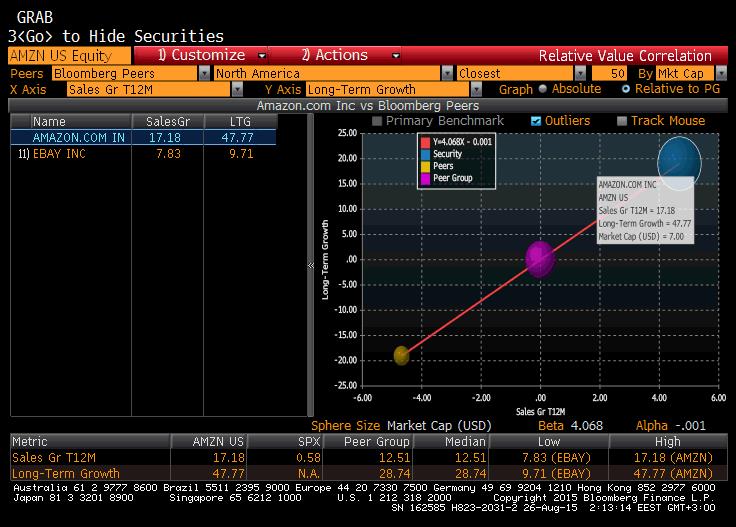Amazon’un satışlarının yaklaşık ’ını yaptığı Kuzey Amerika Pazarı’ndaki tek büyük rakibi olan EBAY ile karşılaştırmalı büyüme ve satış rakamları analizi görülüyor. Grafikte mavi renkli çember Amazon’u temsil ederken, Sarı renkli küçük çember de EBAY’i temsil ediyor. Grafikten de anlaşılacağı üzere bu 1 yıllık süre içerisinde Amazon’un Kuzey Amerika’daki satışları ve büyümesi önemli ölçüde artıyor. Özellikle 2016 yılı içerisindeki analistlerin beklentisi , Kuzey Amerika Pazarı’nda Amazon’un etkinliğini daha da artıracağı yönünde.