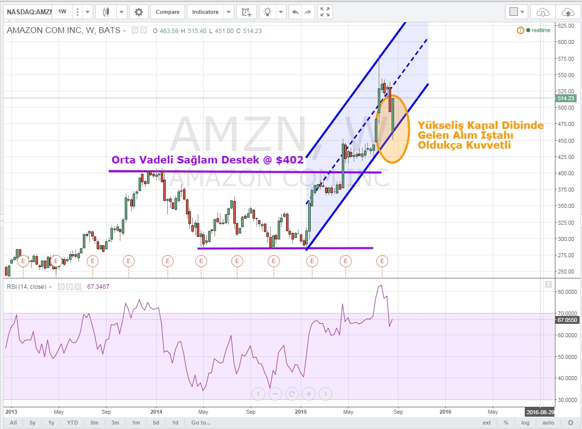 Haftanın geri kalanında oluşturduğu yükseliş kanalını aşağı kırmadığı sürece Amazon için alım iştahının hala canlı olacağını düşünüyorum. Haftalık bazda, ABD endekslerinde yaşanan sert satışa rağmen kanal dibinden gelen güçlü alım piyasada Amazon'a olan yatırımcı ilgisinin sinyali niteliğinde.