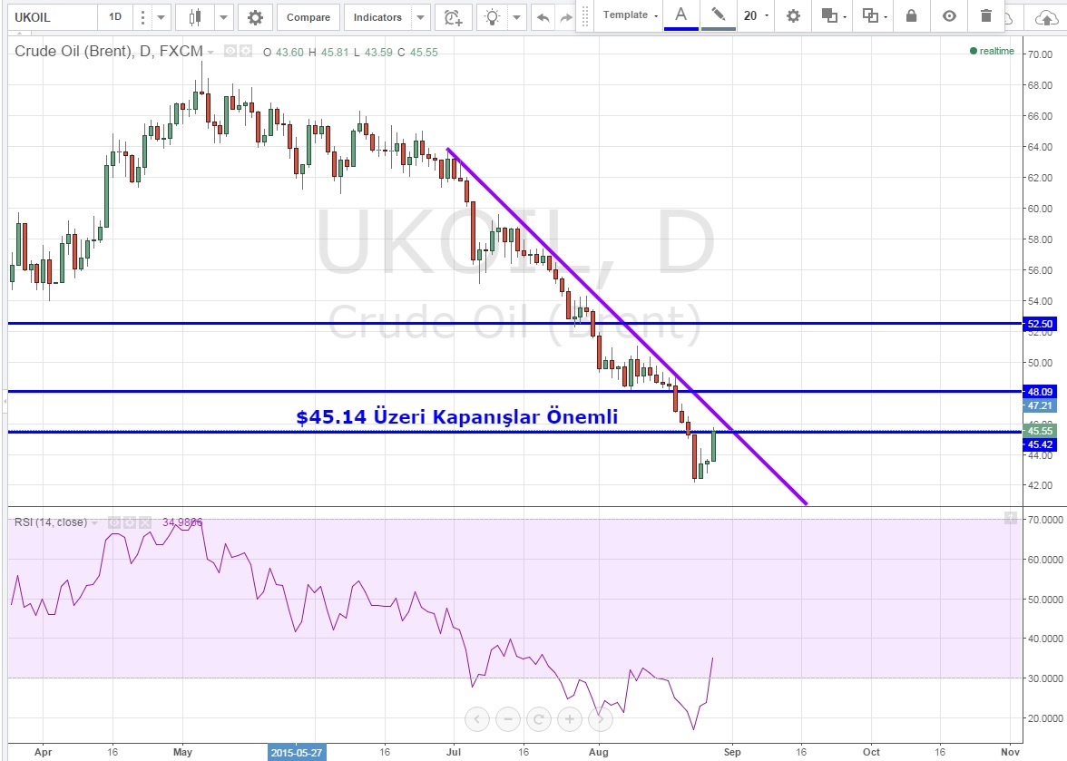 Teknik olarak hala düşüş trendinde olan Brent, $45.14 üzerinde kapanış gerçekleştirebilirse sırası ile