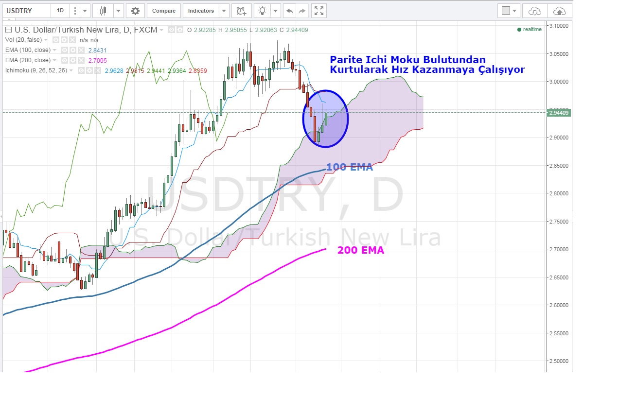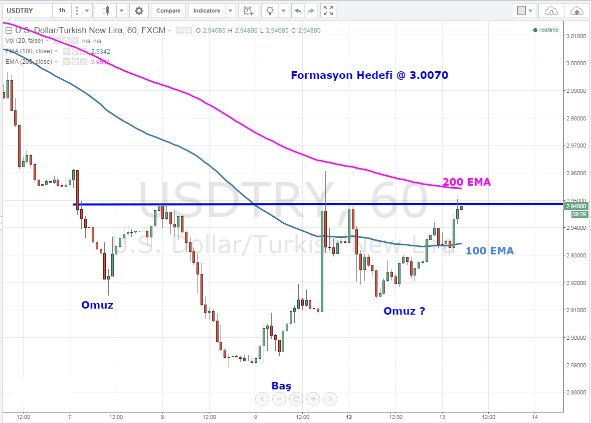 TOBO oluşturmaya çalışan USDTRY için 2.95 üzeri saatlik kapanışlar bizi kısa vadede formasyon hedefi olan 3.0070 seviyesine götürebilir .200 EMA hareketin önünde direnç sayılabilecek tek engel