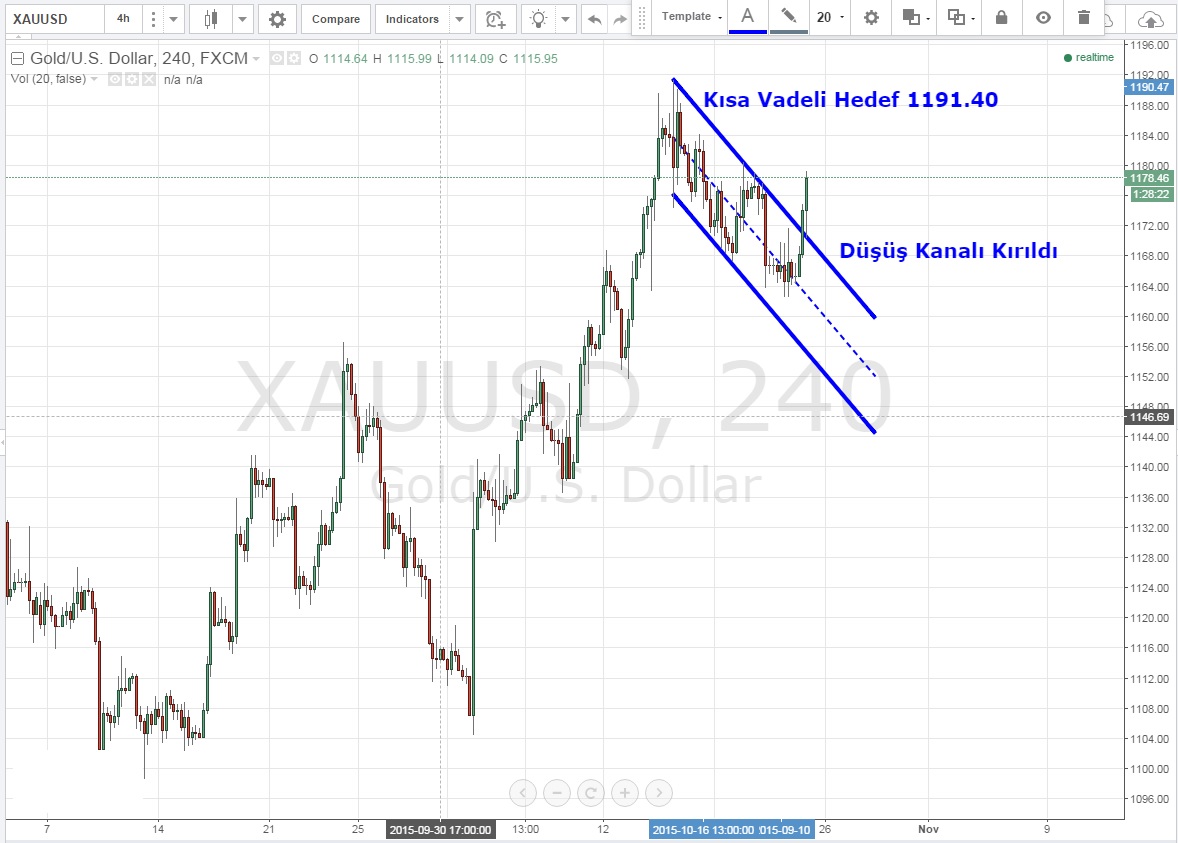 Kısa vadeye indiğimizde ise düşüş kanalını kıran sarı metal 1180 USD 'yi geçmesi durumunda 1191.40 USD 'yi hedefleyecektir