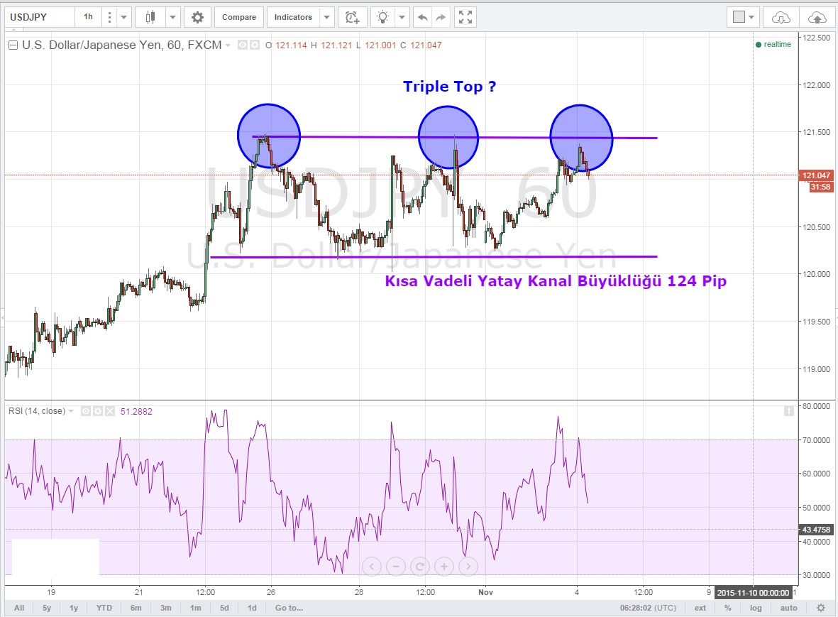 Daha kısa vadeli olarak 124 piplik bir yatay kanal oluşturan paritenin 121.50 seviyesinde 3 'li tepe oluşturmaya başlaması dikkat çekici