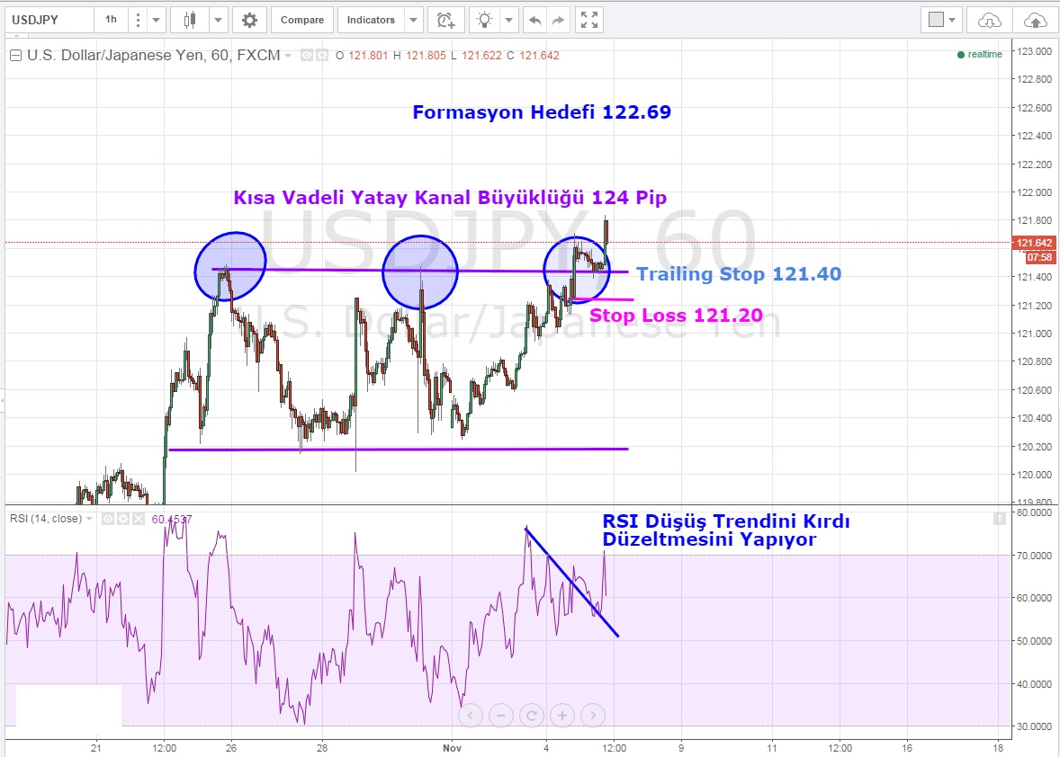An itibari ile 121.70 seviyesinden işlem gören parite uzun süren yatay kanaldan çıkmış görünüyor .Buna göre mevcut Long pozisyonlar için trailin stop seviyesini 121.40 'a çekerek riski minimize etmek iyi bir tercih olabilir