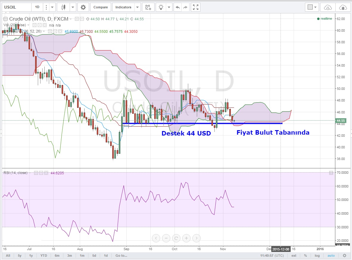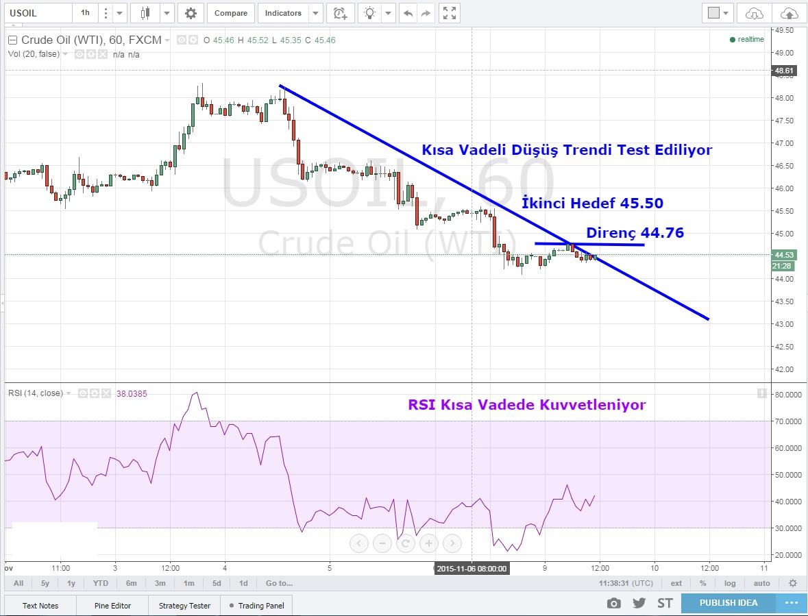 WTI long almak isteyenler için an itibari ile fiyatlar 44.65 USD 'den geçiyor .44.76 USD üzeri saatlik kapanışlar bizi kısa zamanda 45.50 USD hedefine götürebilir