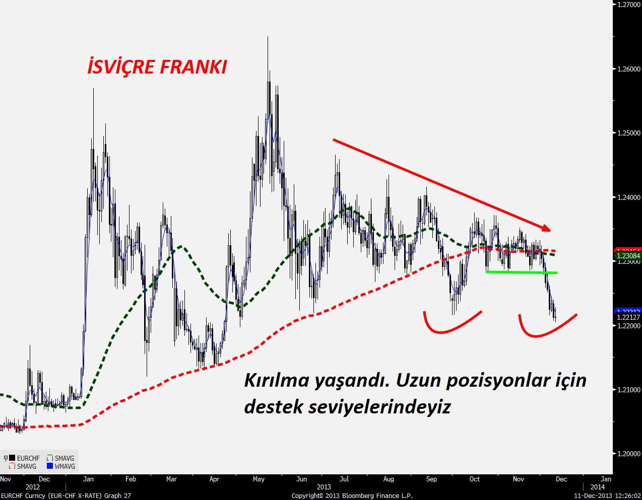 Aşağıdaki grafikten de görülebileceği üzere uzun pozisyon almak isteyenler için destek seviyeleri öne çıkmış durumda. Perşembe günü yapılacak İsviçre Merkez Bankası toplantısında olası bir 1,20 hedefinin kaldırılmasını speküle eden yatırımcılar frank yönünde poisyon aldılar ancak bizim SNB'nin bu tabanı kaldıracağı yönünde bir görüşümüz yok.