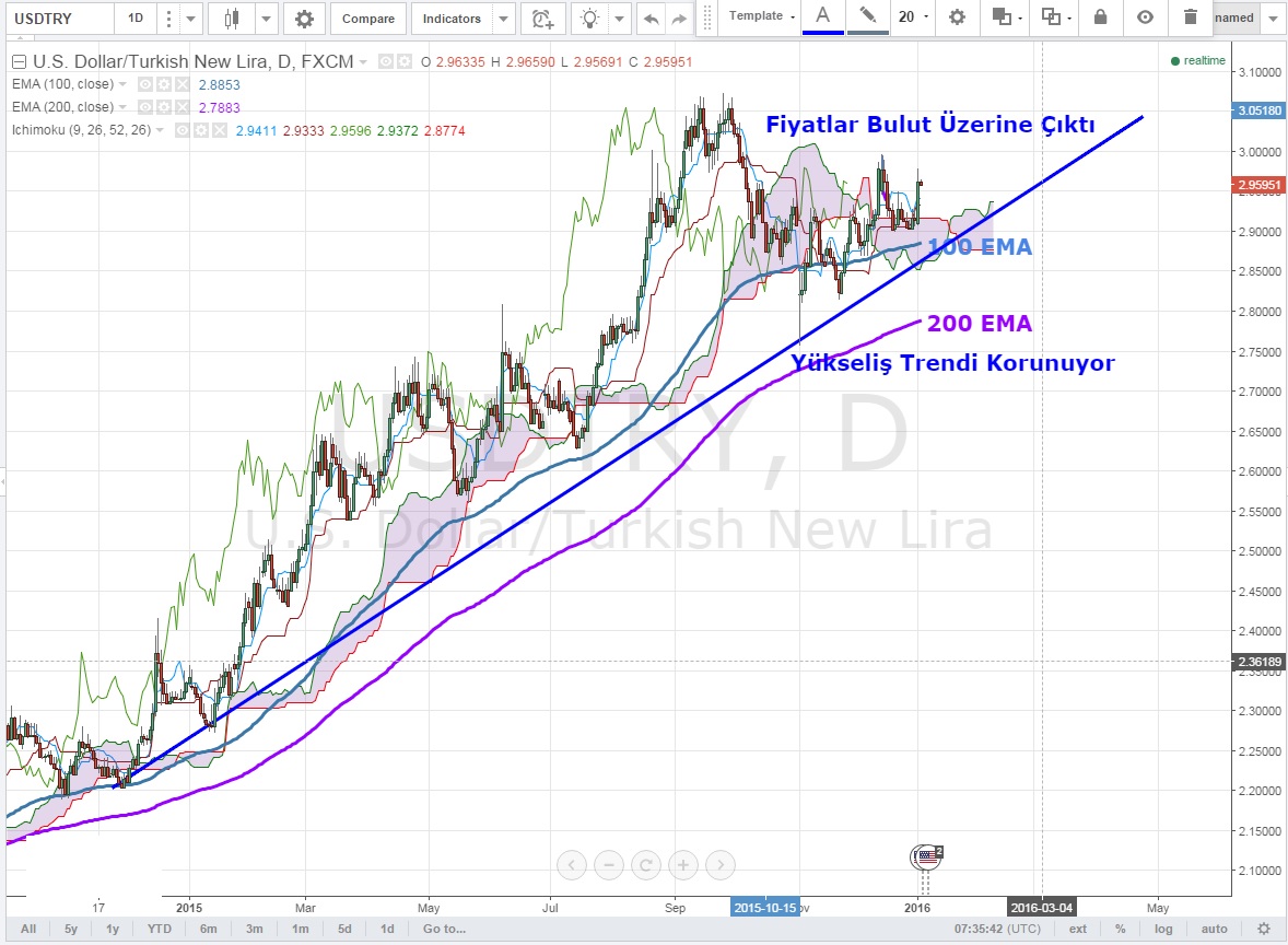 100 EMA 200 EMA ve Ichimoku bulutu üzerinde seyreden fiyatlar USDTRY 'de short için herhangi bir neden bulunmadığını ve boğaların oyunda güçlü taraf olduğunu işaret ediyor