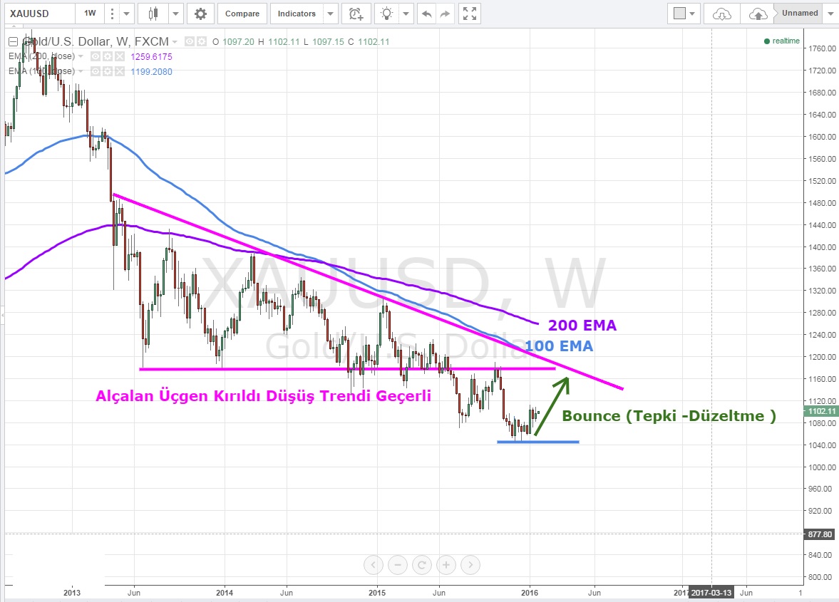 Haftalık grafiklerde alçalan üçgeni kıran XAUUSD 'nin boğaların gayreti ile 1047 seviyesinde dip oluşturarak düzeltme tepki hareketi yapmaya çalışması dikkat çekici