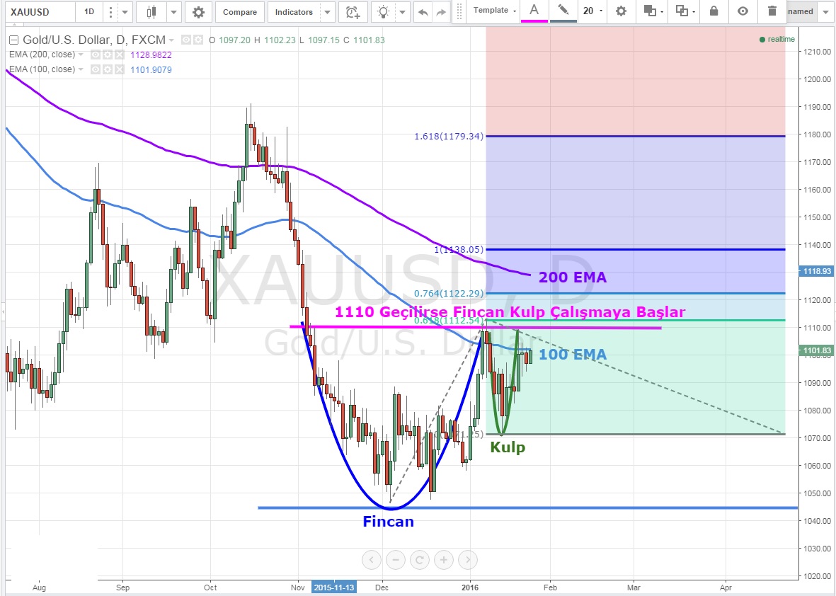 Yine günlük grafiklerde 1047 USD desteğini şu ana kadar tutmayı başaran boğalar fincan kulp oluşturmaya çalışıyor .1110 USD seviyesi geçilirse fincan kulp tamamlanacak