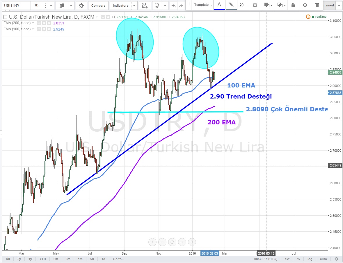 Günlük grafiklerde 2.90 trend desteğini tutan paritenin ilk hedefi 2.96 sonra ki ise 2.9970