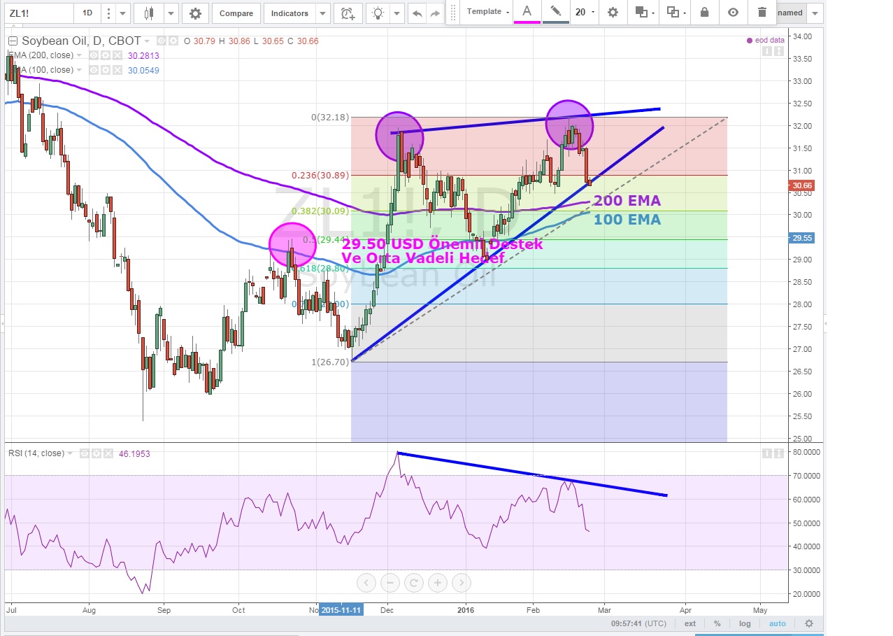 Günlük grafiklerde 32.40 seviyelerinde ikinci tepesini oluşturan Soybean fiyatları RSI tarafından onaylanmadığı için ilk satış sinyali geldi