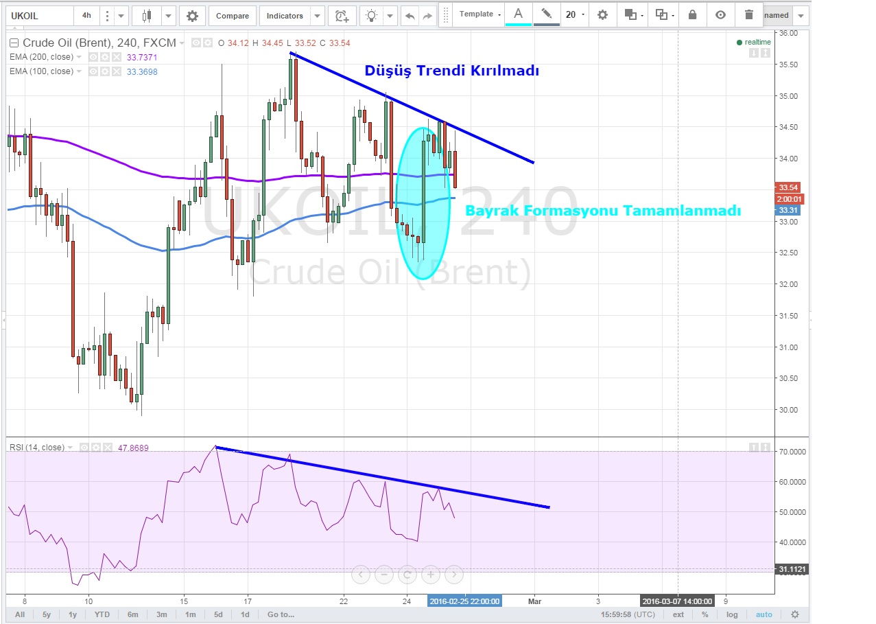 Brent petrolde sabah konuştuğumuz http://www.tradeall.com/teknik-analiz-detay/2580/brent--bogalar-kirmiziyi-ariyor- farklı formasyonlardan bayrak formasyonu tamamlanmadı ve emtia düşüş trendinde hareket ediyor
