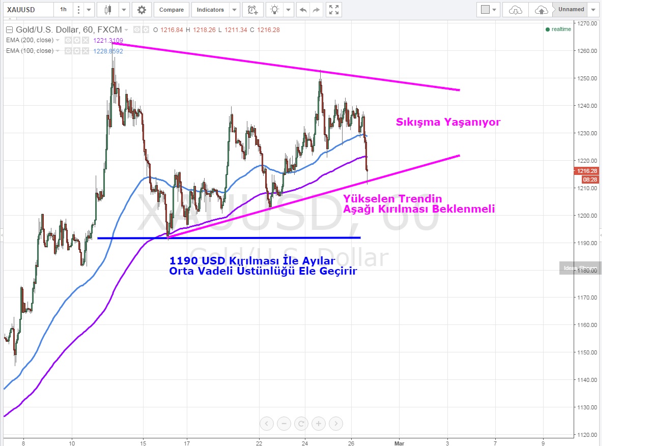 Saatlik grafiklere indiğimzde ise sıkışma yaşanan XAUUSD 'de henüz sinyal gelmedi ve alt trend çizgisi kırılmadan pozisyona girmek tehlikeli olabilir