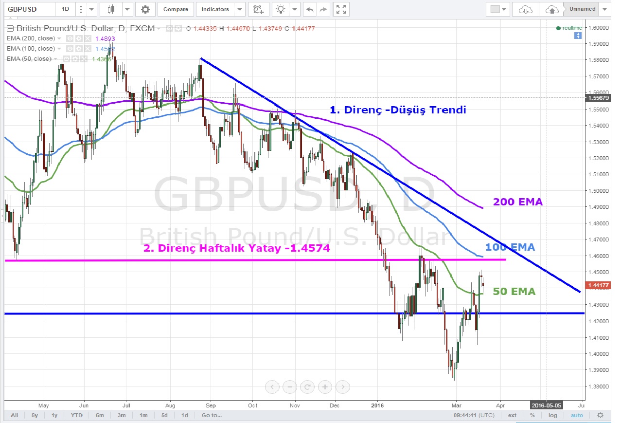 Günlük grafikler Kraliçe 'nin resmen kuşatma altında olduğu izlenimi yaratıyor .Düşüş trendine ek olarak 1.4574 haftalık direnci ve 100 EMA ile 200 EMA altında seyreden pariteye tek tutan destek 1.4233 yatay desteği ile 50 EMA