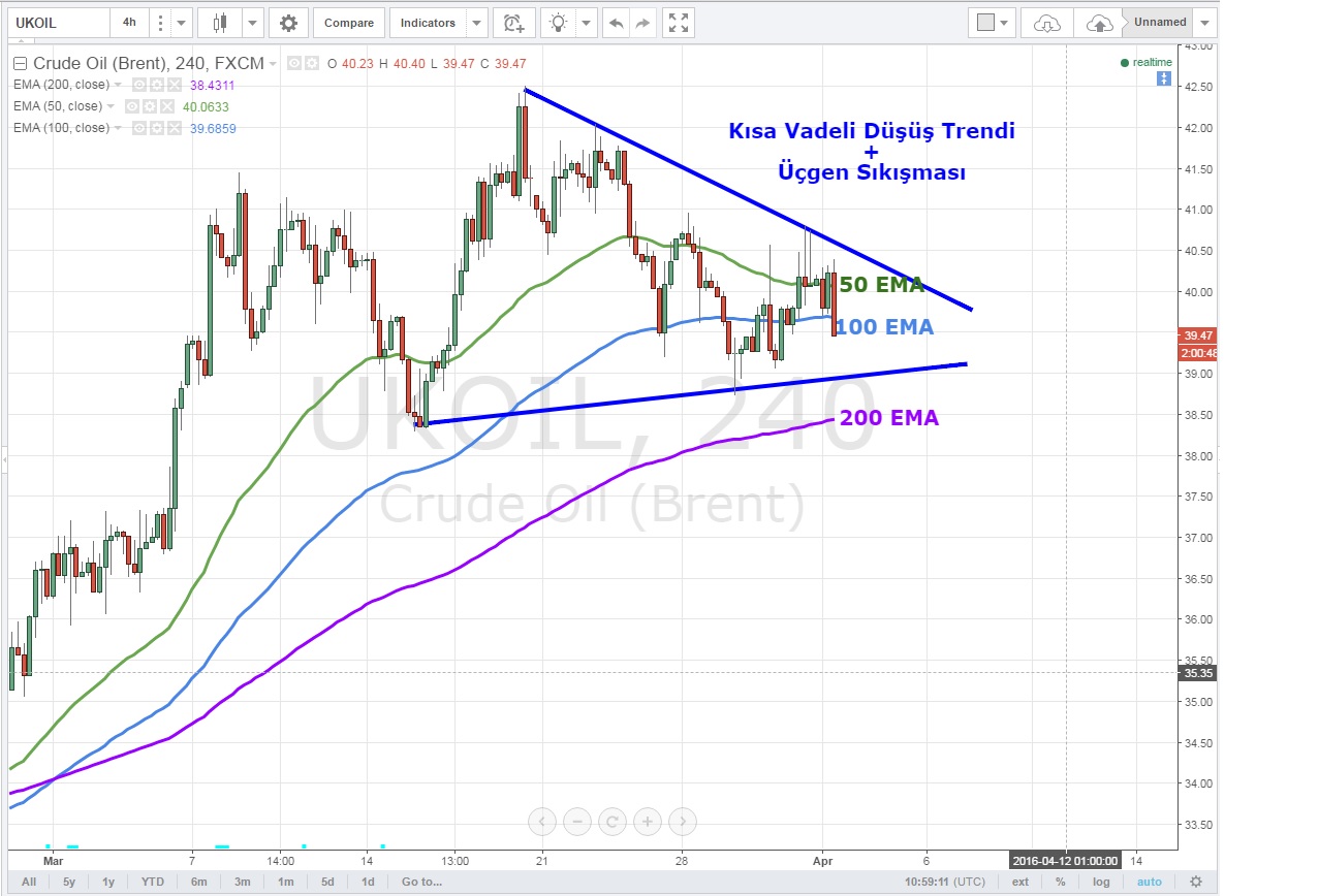 Teknik olarak baktığımızda kısa vadeli düşüş trendine ek olarak üçgen içerisinde sıkışan Brent üçgeni aşağı doğru kırdığı taktirde hareketini hızlandırabilir