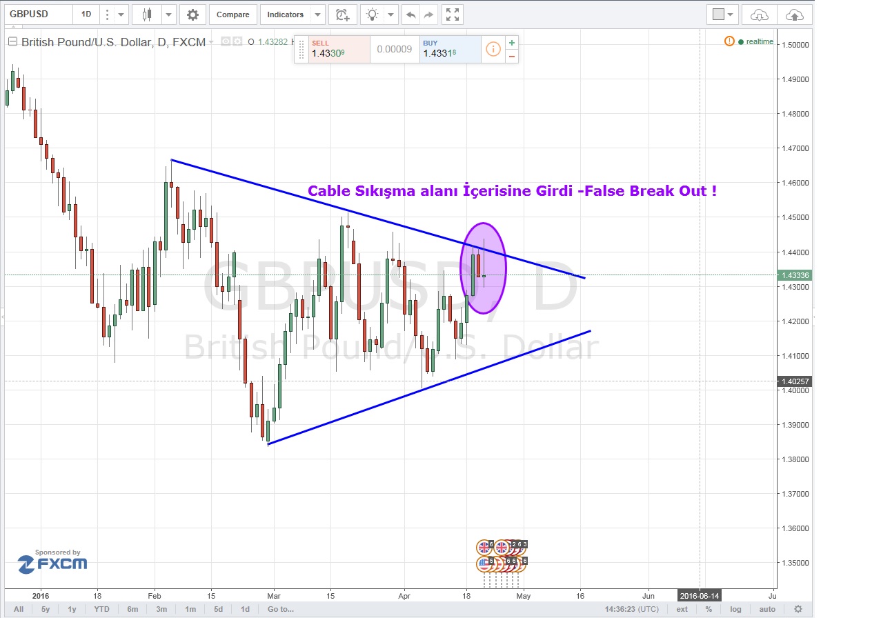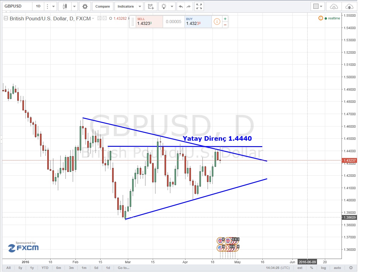 Günlük grafiklerde sıkışma alanını yukarı kırmak üzere olan paritenin 1.4440 seviyesinden yediği sert satış ile üçgen içerisine geri döndüğünü görüyoruz