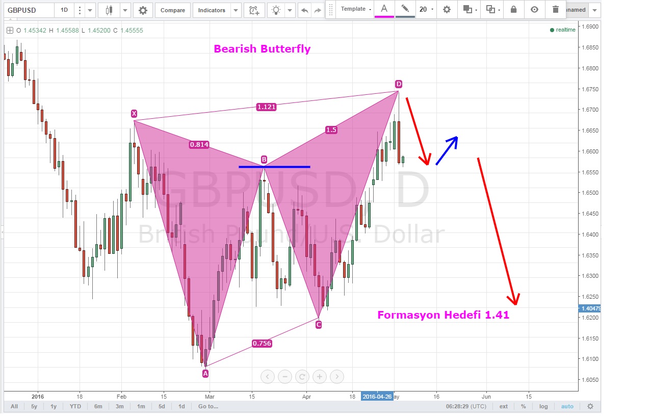 Günlük grafiklerde Bearish Butterfly oluşturdu .Fıormasyon hedefi olan 1.4510 seviyesini kısa vadeli yükseliş trendinin kırılması ile birlikte hızlıca tamamalayan parite 1.4510 desteğini kırması ile birlikte 1.41 hedefine doğru ilerleyebilir