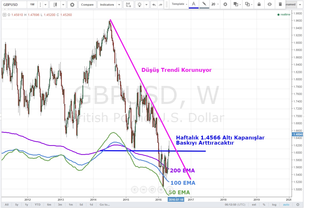 Son olarak haftalık grafiklere baktığımızda ise düşüş trendine olan hamlesi ayılar tarafından sert bir şekilde bastırılan Kraliçe 2de 1.4566 altında gerçekleşecek kapanışlar baskıyı arttıracak ve ilk hedef olarak