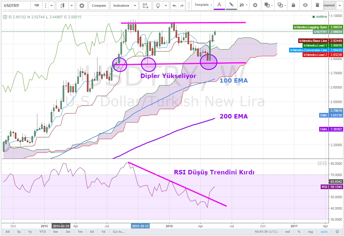 Haftalık grafiklerde daha önce 2.75 seviyelerinde oluşan dibin son dipte 2.79 'da sonlandığını ve