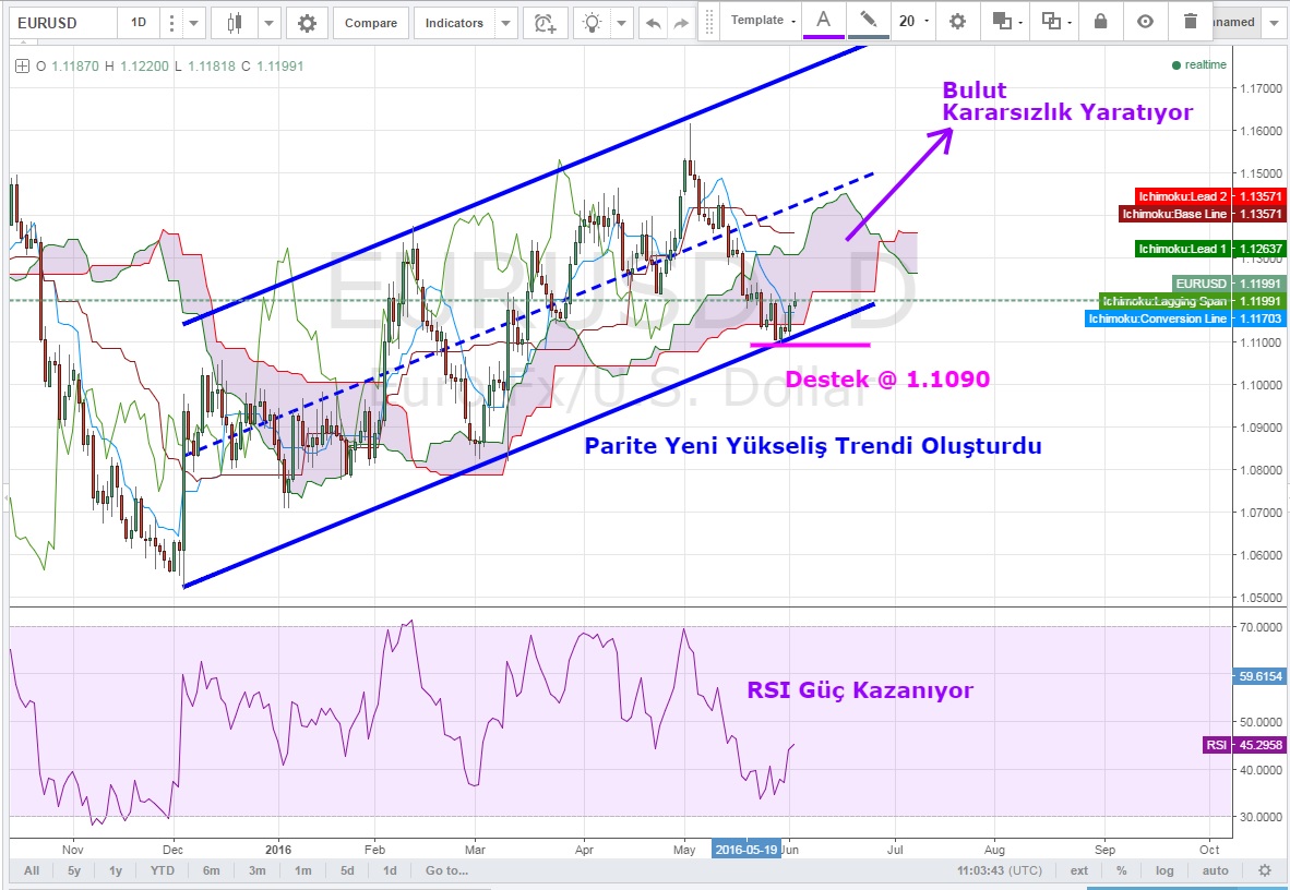 Günlük grafiklerde 1.1090 desteğinin boğalarca tutulduğunu ve buradan bir yükseliş trendi oluşturulmaya çalışıldığını görüyoruz.