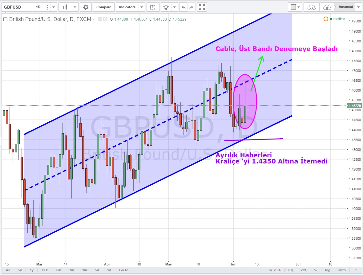 Günlük grafiklerde yükseliş kanalını koruyan paritenin, kanalın orta bandına doğru atak yaptığını görüyoruz. İlk denemesi başarısız olan Cable 'ı dün çıkan ayrılık haberlerinin 1.4350 altına itememesi ise dikkat çeken bir başka sinyal